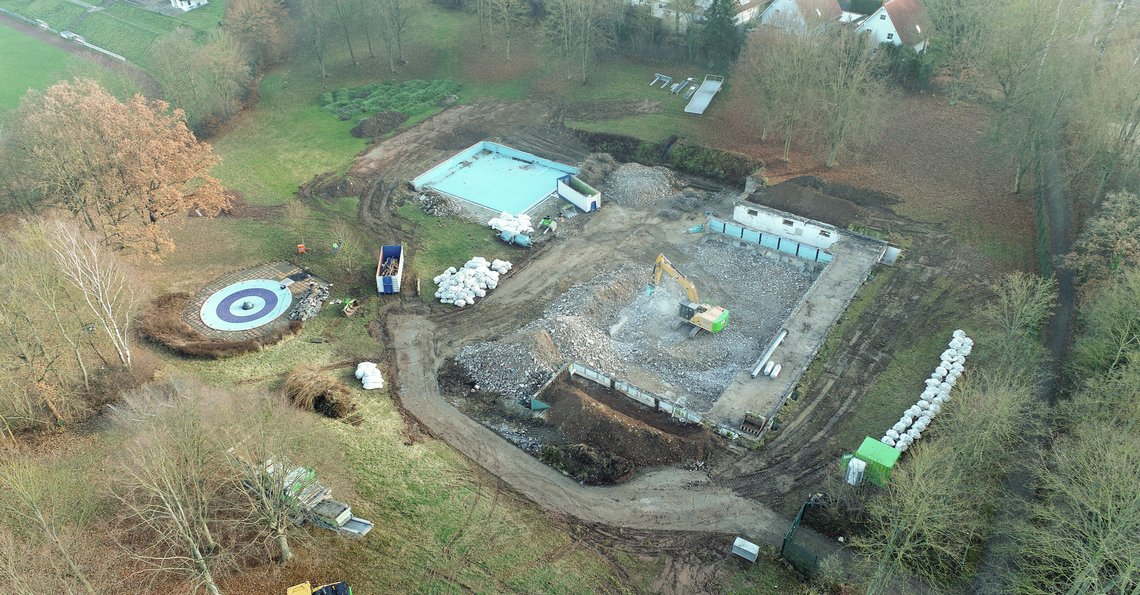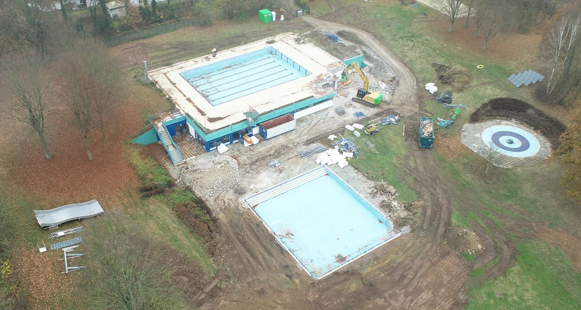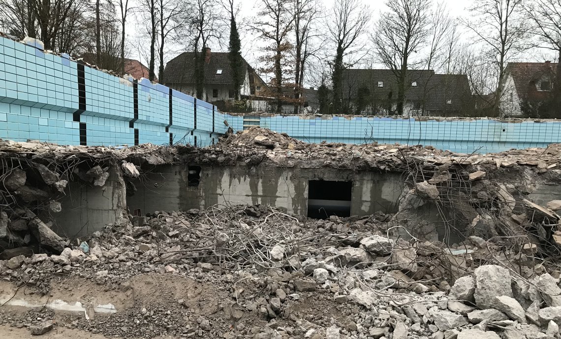 Erster Schritt: umfangreiche Abbruch arbeiten. Dabei wird erhalten, was sinnvoll und möglich ist. Alles andere wird sauber getrennt und entsorgt oder zum Wiedereinbau als Tragschicht vor Ort gebrochen. Kurze Wege und Kreislaufdenken im Sinne der Nachhaltigkeit sind hierbei das Motto. Die Planung sieht das Anheben der Beckenplatte um rd. 1,60 m vor. So entsteht auf Basis des Nichtschwimmerbeckens ein Schwimmerbereich mit 2,80 m Wassertiefe, wodurch Attraktionen wie eine Kletterwand am Wasser möglich werden. Zukünftig sind alle Funktionsbereiche des Bades barrierefrei auf einer Höhe um das zentrale Kombibecken angeordnet. Die anstehende Sanierung wird also zur Neuausrichtung des Bades genutzt und setzt neue Maßstäbe in der regionalen Bäderlandschaft. Das betrifft die biologische Wasseraufbereitung ebenso wie die Photovoltaikanlage auf den Gebäudedächern, aber auch das Freizeitangebot mit Bahnen schwimmen, Waterclimbing, Flachwasserlagune, Wasserrutsche und einer Boulderwand am Sandstrand.