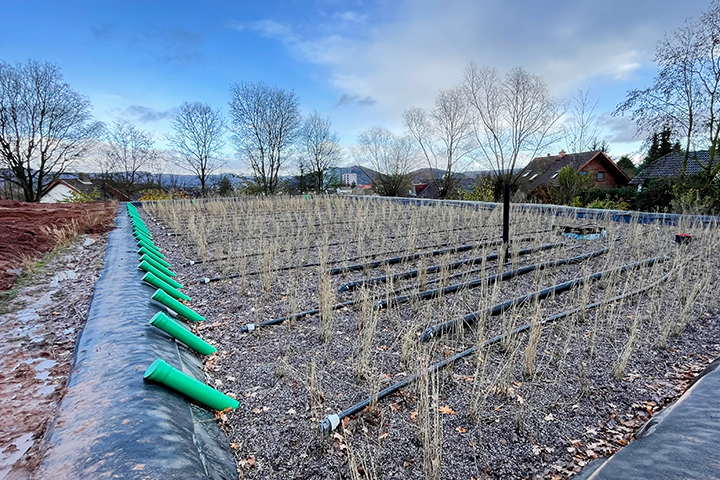 Auch das zentrale Element der biologischen Wasseraufbereitung, der Geomatrix®-Bodenfilter, ist bereits fertiggestellt und sogar schon mit Schilf bepflanzt. In einem geschlossenen Wasserkreislauf wird das Badewasser später auf die Geomatrix® gepumpt und physikalisch und biologisch gereinigt. Im Wurzelbereich der Schilfpflanzen beseitigt eine natürliche Lebensgemeinschaft aus Mikroorganismen schädliche Keime und Bakterien und sorgt für hygienisch einwandfreies Badewasser – wie frisch aus der Quelle. Erst durch diese Ökotechnik, die ganz ohne chemische Zusätze auskommt, ist die naturnahe Gestaltung des Freibades möglich: mit hölzernen Stegen und Abtrennungen, Sandstrand und einer Bepflanzung bis zum Beckenrand.