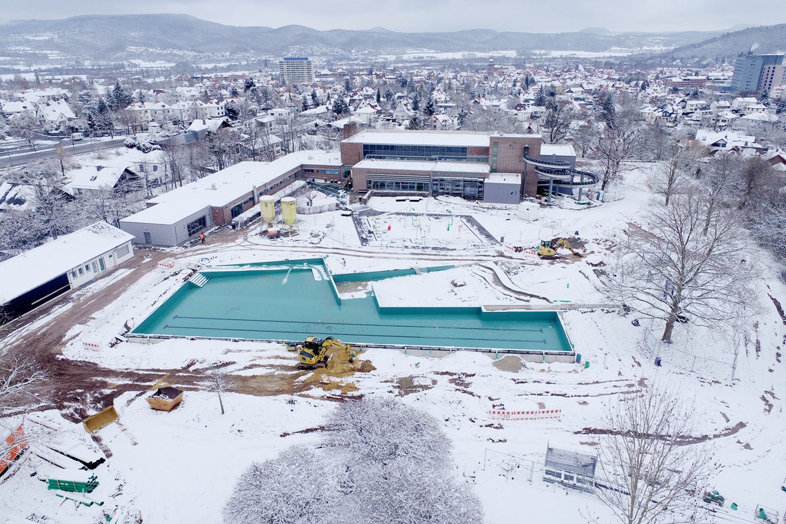 Seit dem offiziellen Spatenstich am 22. März letzten Jahres hat sich auf dem Außengelände des espada-Hallenbades einiges getan. Da wo zuvor noch Wiese war, ist das Kernstück des neuen FreibadPLUS entstanden, eine rund 1.000 Quadratmeter große Beckenlandschaft mit mehreren 50-Meter-Bahnen, Lagune und Sandstrand. Erkennbar sind auch bereits eine Felseninsel und weitere Gestaltungselemente aus Kunstfels. In den letzten Wochen wurden vorwiegend Erd- und Rohrleitungsarbeiten rund um die Beckenlandschaft ausgeführt und die Vorarbeiten für die Stege abgeschlossen. Ein wichtiges Etappenziel war es, die Becken noch vor Beginn des Winters mit Wasser zu füllen – und dieses Ziel wurde erreicht.