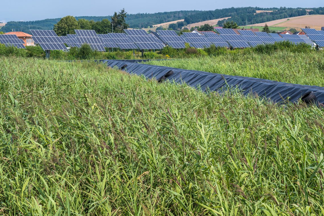 Die vergleichsweise großen Areale einer Klärschlammvererdungsanlage bieten ausreichend Platz für eine Photovoltaikanlage. Besonders die nach Süden ausgerichteten Außenwälle der Schilfbeete sind ideal für die Bestückung mit Solarzellen. Durch die meist unmittelbare Nähe zur Kläranlage kann der Solarstrom direkt zu deren Energieversorgung genutzt werden. Dadurch lässt sich die CO2-Bilanz noch einmal um mehr als 50 Prozent verbessern. Richtig dimensioniert, kann die PV-Anlage darüber hinaus einen nicht unerheblichen Teil des gesamten Stromverbrauchs der Kläranlage liefern.