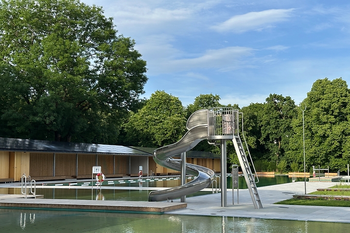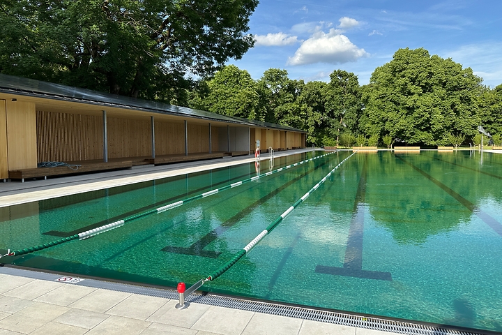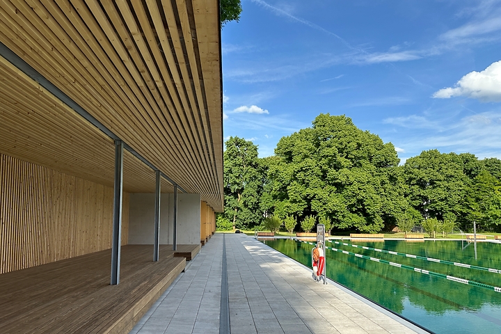 Bis 2040 wollen die Münchner Stadtwerke alle ihre Bäder auf CO2-neutralen Betrieb umstellen. Diese Vorgabe machte für die notwendige Sanierung des traditionsreichen Freibades Georgenschwaige im Münchner Stadtteil Schwabing eine grundsätzliche Neuausrichtung erforderlich. Gleichzeitig sollte aber der Charakter des Bades bewahrt werden, das immerhin seit fast 100 Jahren ein fester Bestandteil der Münchner Freizeitlandschaft ist. Dafür wurden die Schwimmbecken in ihrer Bestandsform weitgehend erhalten, in ihrer Nutzung aber neu interpretiert. Anstelle des Sprungbereichs wurde ein barrierefreier Zugang ins Schwimmerbecken geschaffen und der Nichtschwimmerbereich erhielt einen Strandeinstieg mit sandbedecktem Boden. Das Gebäudekonzept wurde hingegen völlig neu gedacht. Die vorher getrennten Funktionsbereiche wurden in einem, überwiegend in Holzbauweise neu errichteten Gebäude am nördlichen Beckenrand zusammengefasst und bildet eine klare Raumkante im Gelände. Eine Photovoltaikanlage auf der gesamten Dachfläche erzeugt regenerative Energie.